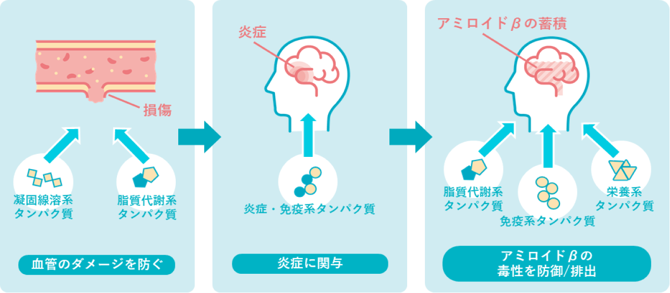MCIスクリーニング検査プラスは、アミロイドβの蓄積を阻害するタンパク質や、アミロイドβが蓄積する前のリスクとなる血管の損傷や炎症に関連するタンパク質を調べる血液検査です。