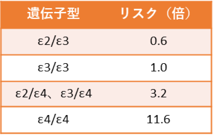 ε4を全く持たない遺伝子型に対し、ε4を1つないし2つ持っている遺伝子型のアルツハイマー病の発症リスクは約3~12倍高くなると言われています。